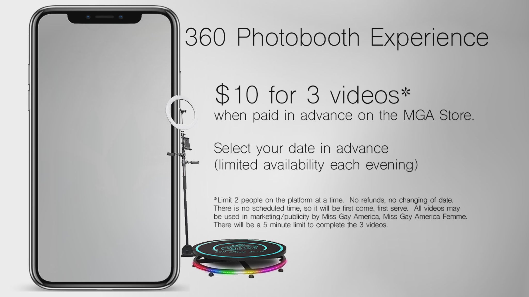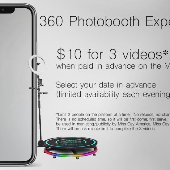 Step on up and capture your MGA experience in full 360 glory. All videos will be uploaded and shared by January 19. You will receive a digital ticket for your date upon checkout. Videos on site will be $20 per 5 minute session, so this rate is 50% off. This will be for a 5 minute session. You will have 5 minutes to capture your 3 videos. We may recommend booking for 6 videos if you like options, but this is a perfect opportunity to capture a moment with friends, or your favorite forever Miss Gay America. We do have a 2 person limit on the platform at any given time. There are no refunds. Final call is 9:45 pm each night. If you are not in line by this time, you may forfeit your reservation. All reservations are first come, first serve. By purchasing you release all liabilities of injury, as well as the ability to share your video on official Miss Gay America/Miss Gay America Femme, and MGA Store platforms.